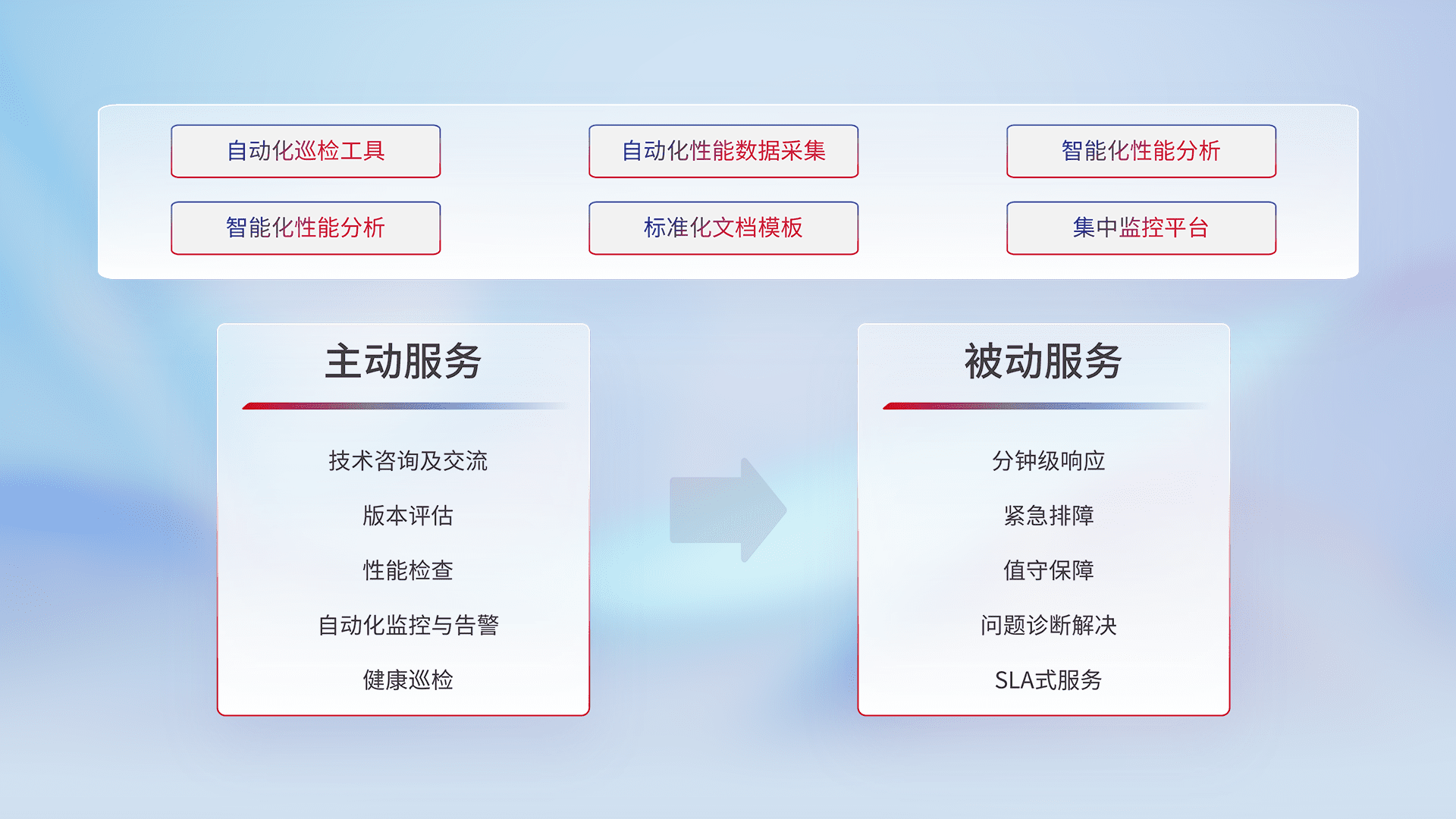 智能化工具和标准化文档,,,保障服务质量,,,,提供主动服务(包含技术咨询、、、版本评估、、性能检查、、自动化监控与告警、、健康巡检)和被动服务包含(分钟级响应、、、、紧急排障、、、、值守保障、、、问题诊断解决、、SLA服务)。。。